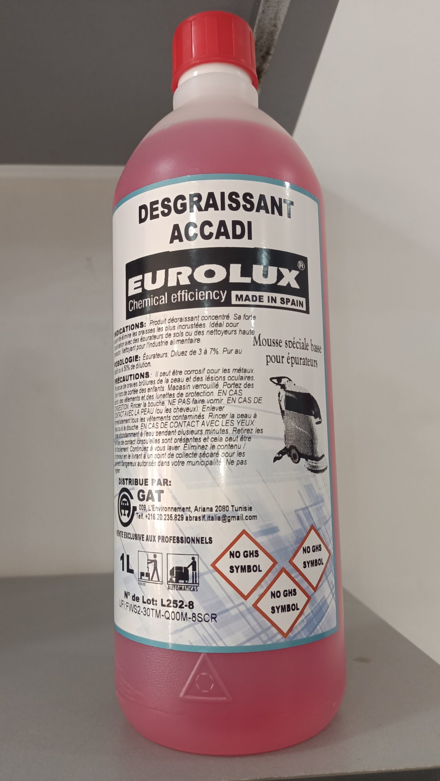 Il s’agit d’une bouteille de dégraissant EUROLUX Accadi, un produit chimique conçu pour le nettoyage industriel ou professionnel.