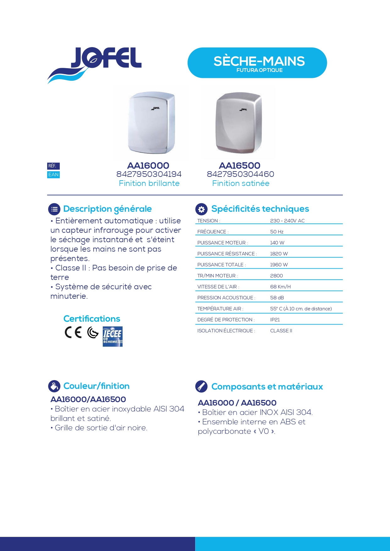 SÈCHE-MAINS FUTURA OPTIQUE en acier inoxydable AISI 304, brillant, JOFEL