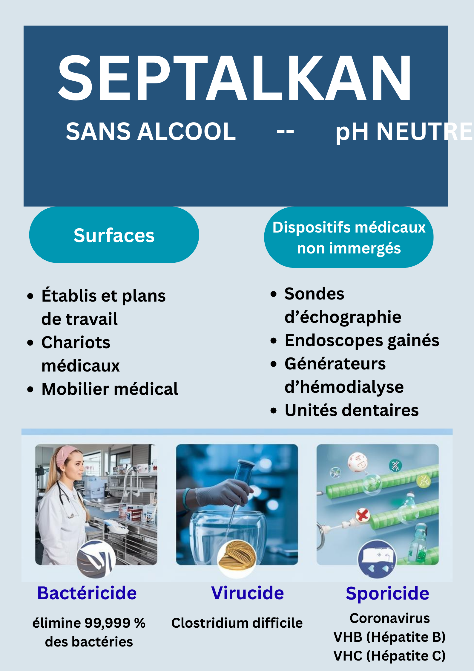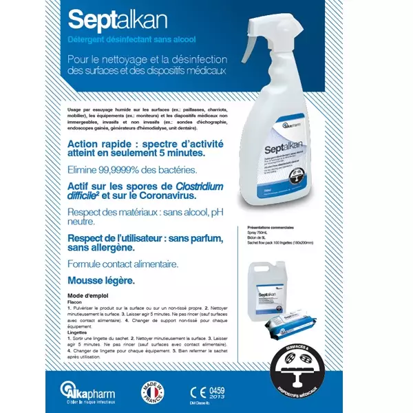 SEPTALKAN est un détergent désinfectant sans alcool, surfaces et dispositifs médicaux non immergés